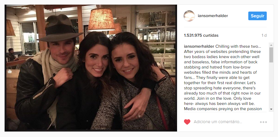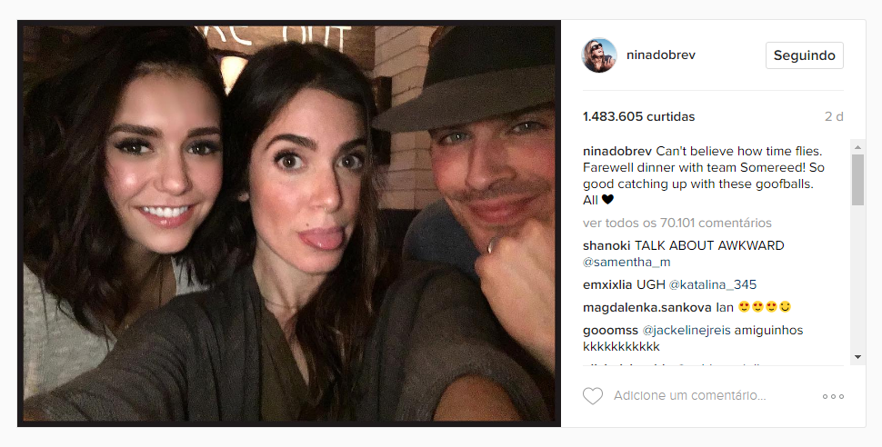 Antes disso, nós ficamos em êxtase com a confirmação do retorno de Nina Dobrev como Elena no último episódio da série, feita pela própria atriz na sua conta do Instagram. Logo em seguida, tanto ela quanto Ian, postaram fotos com Nikki Reed, atual esposa do ator – que já tinha namorado por um longo tempo com Dobrev. Com duas fotos, eles afastaram os rumores que Nina e Nikki não se suportavam e ainda mostraram belos sorrisos. Até porque chega de empurrar rixinhas entre mulheres por causa de relacionamentos na mídia, né? Foi só amor <3 .